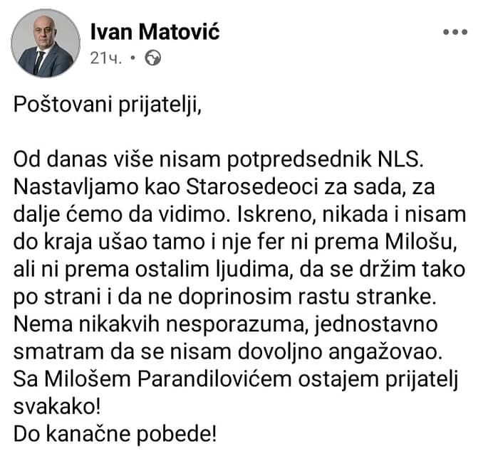 Lider Udruženja starosedelaca Kraljeva Ivan Matović podneo je neopozivu ostavku na mesto potpredsednika pokreta Novo lice Srbije koji vodi kontroverzni Miloš Parandilović.